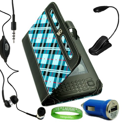 Amazon Kindle 3G Kit: for (Kindle with 6? Display) Harlan BLUE Checker Plaid Melrose Leather Flip Case + Earphones + BLUE Compatible Kindle 3G USB Car Charger + an LED Reading Light + Live * Laugh * Love VanGoddy Wrist band!!! Overview